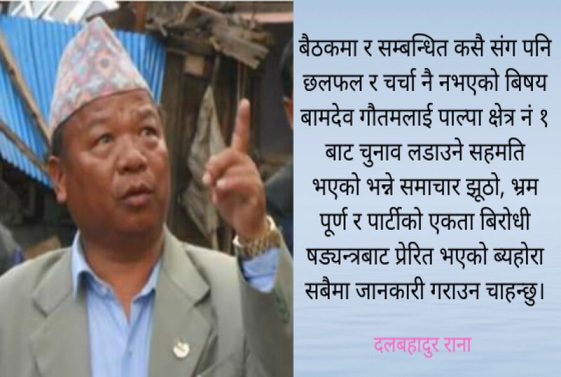 पार्टी प्रवक्ता नारायण काजी श्रेष्ठले उपयुक्त समयमा उपाध्यक्ष बामदेव गौतमलाई प्रतिनीधी सभामा लैजाने निर्णय भएको जानकारी दिनु भयो । तर प्रवक्ता श्रेष्ठको भनाई बिभिन्न सन्चार माध्यमहरुबाट प्रत्यक्ष प्रशारण गरिएको केहिवेरमै बामदेव गौतमलाई पाल्पाको क्षेत्र नं १ बाट प्रतिनिधीसभामा लैजाने निर्णय भएको समाचार भाईरल बनाईएको थियो । फेसबुक ट्विटर र म्यासेन्जर मार्फत भाईरल बनाउने गरी प्रवाह गरिएको उक्त सन्देश भने झुठो भएको भन्दै पाल्पावाट निर्वाचित सांसद दल बहादुर रानाले प्रेसनोट जारी गर्नु भएको छ । बाहिर आएको समाचारमा भनिए जसरी दल बहादुर रानालाई राजिनामा गराएर उपाध्यक्ष गौतमलाई प्रतिनीधी सभामा लैजाने कुनै निर्णय नभएको एक सचिवालय सदस्यले बताउनु भयो। सांसद रानाले जारी गरेको प्रेसनोटमा बैठकमा र सम्बन्धित कसैसंग पनि छलफल र चर्चा नै नभएको बिषय बामदेव गौतमलाई पाल्पा क्षेत्र नं १ बाट चुनाव लडाउने सहमति भएको भन्ने समाचार झूठो, भ्रम पूर्ण र पार्टीको एकता बिरोधी षड्यन्त्रबाट प्रेरित भएको ब्यहोरा सबैमा जानकारी गराउन चाहन्छु रानाले भन्नु भएको छ ।
