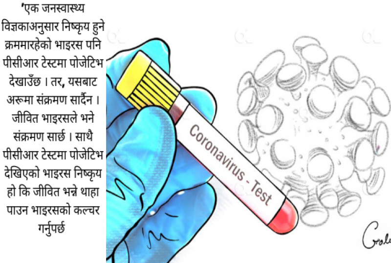’एक जनस्वास्थ्य विज्ञका अनुसार निष्कृय हुने क्रममा रहेको भाइरस पनि पीसीआर टेस्टमा पोजेटिभ देखाउँछ । तर, यसबाट अरूमा संक्रमण सार्दैन । जीवित भाइरसले भने संक्रमण सार्छ । साथै पीसीआर टेस्टमा पोजेटिभ देखिएको भाइरस निष्कृय हो कि जीवित भन्ने थाहा पाउन भाइरसको कल्चर गर्नुपर्छ ।त्यसैले पुनः पोजेटिभ देखिएको मानिसलाई फेरि आइसोलेसमा राखिएको उनी बताउँछन् । एनका अनुसार यस्ता केसलाई पुनः संक्रमणको साटो पुनः पोजेटिभ भन्नु उपयुक्त हुन्छ । किनकि अरू कसैले भाइरस सारेको नभई आफ्नै शरीरमा भएको भाइरस देखिएको हो ।