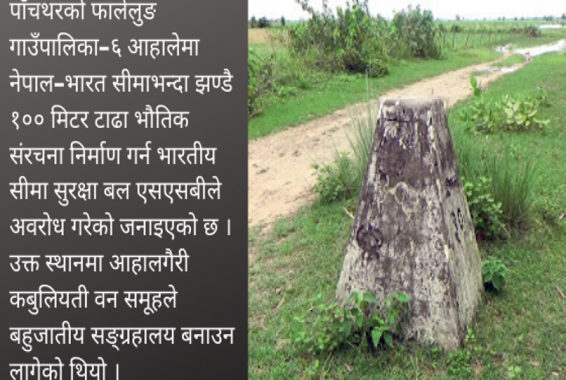 फिदिम १ जेष्ठ । नेपाली भूमिमा भौतिक संरचना निर्माण गर्न भारतीय पक्षले अवरोध पु¥याएको छ ।पाँचथरको फालेलुङ गाउँपालिका–६ आहालेमा नेपाल–भारत सीमाभन्दा झण्डै १०० मिटर टाढा भौतिक संरचना निर्माण गर्न भारतीय सीमा सुरक्षा बल एसएसबीले अवरोध गरेको जनाइएको छ ।उक्त स्थानमा आहालगैरी कबुलियती वन समूहले बहुजातीय सङ्ग्रहालय बनाउन लागेको थियो ।  सो समूहले निर्माण गर्न लागेको सङ्ग्रहालय क्षेत्र आफ्नो भूभागमा पर्ने झुठो दाबी एसएसबीले गरेको छ ।