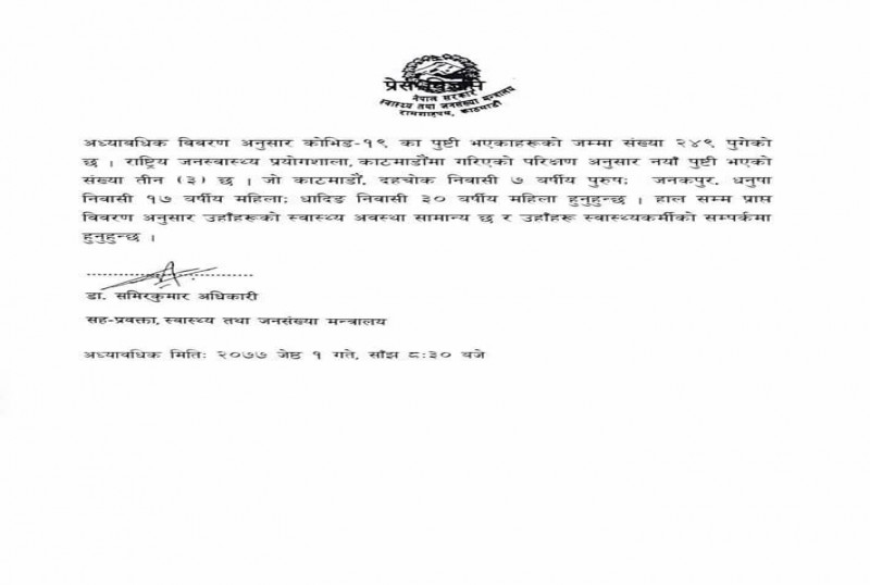 राष्ट्रिय जनस्वास्थ्य प्रयोगशालामा गरिएको परीक्षणमा थप ३ जनामा कोरोना संक्रमण पुष्टि भएको स्वास्थ्य मन्त्रालयका सहप्रवक्ता डाक्टर समिर अधिकारीले जानकारी दिनुभयो । संक्रमितहरुमा काठमाडौंको दहचोकका ७ वर्षि बालक, जनकपुर धनुषाका १७ वर्षीया युवती र धादिङकी ३० वर्षीया महिलामा कोरोना संक्रमण पुष्टि भएको छ ।