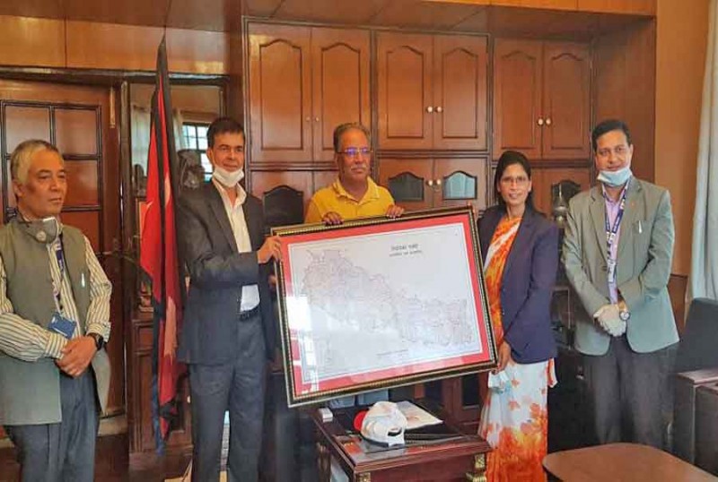 काठमाडौँ १० जेष्ठ । नेपाल कम्युनिष्ट पार्टी नेकपा का अध्यक्ष एवं पूर्वप्रधानमन्त्री पुष्पकमल दाहाल ‘प्रचण्ड’ लाई सरकारका तर्फबाट नेपालको अद्यावधिक नक्सा हस्तान्तरण गरिएको छ । भूमि व्यवस्था, सहकारी तथा गरिबी निवारण मन्त्री पद्माकुमारी अर्यालले आज अध्यक्ष दाहाललाई लिम्पियाधुरा, लिपुलेक र कालापानी समावेश गरिएको नक्सा हस्तान्तरण गर्नुभयो । मन्त्री अर्यालले दाहाल निवास खुमलटार पुगेर नेपालको राजनीतिक तथा प्रशासनिक नक्सा प्रदान गर्नुभएको हो ।सो अवसरमा अध्यक्ष दाहालले नक्सा तयार पार्न खट्ने मन्त्रीसहित मन्त्रालयका सम्पूर्ण कर्मचारीलाई धन्यवाद दिनुभएको थियो । मन्त्री अर्यालले आफूहरु नक्सा प्रकाशनको तयारी अवस्थामा नै रहेको र त्यसका लागि पार्टी र सरकारको निर्देशनको पखाईमा रहेको स्पष्ट पार्नुभएको थियो । सो अवसरमा मन्त्रालयका सचिव, नापी विभागका महानिर्देशक, उपमहानिर्देशकलगायतको उपस्थिति रहेको अध्यक्ष दाहालको सचिवालयले जनाएको छ ।