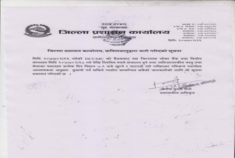 कपिलवस्तु १६ जेठ । जिल्ला प्रशासन कार्यलय कपिलवस्तुले नयाँ निर्णय गरेको छ । जस अनुसार भोली देखि सबै बित्तिय संस्था खुल्ने भएका छन् । अत्याबश्यक सेवाका पसलहरु हरेक दिन विहान ७ देखि ९ सम्म खुल्ने भएका छन् । नदी जन्य पदार्थ डमपीङ गरिएको क्षेत्रवाट ओसार पसार गर्न पाइने भएकोछ । जिल्ला स्थित सुरक्षा समितिको बैठकले उक्त निर्णय गरेको हो ।
